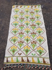 It's a unique piece, perfect for adding a touch of global style to any room. Type: Kilim. Color: Multicolor (cream, brown, yellow, green). Style: Traditional, Oriental. Material: Wool. Construction: Handmade.