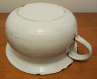 This antique small enamelware chamberpot is a great addition to any collection. With a charming design and durable construction, this bowl is perfect for antique collector. Its unique features include a beautiful design with a lip on the edge. Whether you're a collector or just looking for a unique piece to add to your collection, this antique small enamelware chamberpot is sure to impress. Its classic design adds a touch of elegance. So why wait? Add this beautiful bowl to your collection today! 9 inch diameter antique small Enamelware chamberpot, chips on sides, edges, handles, and inside.