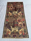 The rug featuresdetailed animal and tree motifs, woven in earthy brown, beige, red, and black tones. The rug’s intricate motifs and rare design reflecttraditional tribal artistry, making it ideal for collectors and interior decorators looking for arare one-of-a-kind handmade rug.