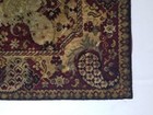 Showcasing intricate designs and rich colors. It features a complex pattern with floral and paisley motifs, predominantly in shades of red, gold, and green. The carpet's texture is visibly soft and plush, indicative of velvet.