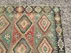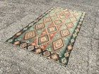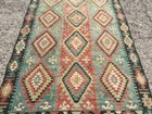 Distressed Fine Vintage Traditional Hand Made Oriental Wool Green Kilim 242x136cms. Distressed true vintage rug. Pictures are part of the description. All Pictures are taken outdoor under sunlight. Pictures appear more brighter under natural light. ALL THE INFORMATION IS GIVEN TO BEST OF OUR KNOWLEDGE HOWEVER HUMAN ERROR IS ALWAYS POSSIBLE.
