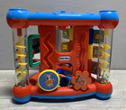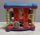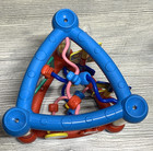 Brand: Little Tikes Item: Triangular plastic activity center toy for babies and infants. Color: Bright multi-color design with red base, blue frame, yellow and green accents. Design: Triangular frame with clear tubes on each corner filled with colorful beads that rattle and roll down spiral ramps. Details: Center panels include sliding tracks, textured grips, and spinning picture discs with Little Tikes characters including a helicopter and a smiling vehicle. Additional play features: Rotating alphabet and number tiles (A, B, 1, 2, 3), bead maze loops on top, and various knobs and sliders for fine-motor practice. Construction: Durable molded plastic, no batteries required; intended as a hands-on learning and sensory toy for babies and toddlers.