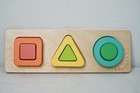This Lovevery wooden Montessori shape puzzle is designed to spark curiosity and support early learning through play. The set includes three colorful stacking shapes—a square, triangle, and circle—on a sturdy wooden board, encouraging toddlers to explore fine motor skills, spatial awareness, and shape recognition.