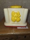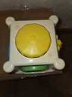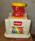 The toy is vintage from 1990 and is from Playskool. It is white and red at bottom. You push yellow top at top red bear pops up. You can also push it down. on on side it has a rainbow thing you can spin. on one side it has a blue thing you move side to side and it shows a cat awake and move it to the side a cat sleeping. One side it has a green dial and the other side has a yellow rabbit you push down and it squeaks. It does have some staining and discoloration from age. a small chip above the blue thing you move ( as pictured)