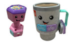 Fisher-Price Laugh & Learn baby toy bundle featuring two interactive learning toys: a musical dumbbell and a pretend coffee cup. Both toys are designed to engage babies and toddlers with lights, sounds, music, and hands-on play.