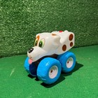 This playful toy dog truck features vibrant blue wheels and a charming white body with brown spots. Perfect for imaginative play.