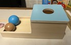The Montessori Ball Drop Box is a wooden toy designed for babies to promote object permanence and motor skill development. Made of real wood. There is a light indentation along one side, as pictured. It features Perfect for aiding in the development of babies, this toy is a great addition to any baby's playtime. The ball is not included but can be found at most craft stores.