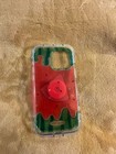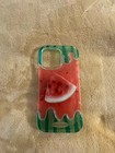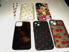 5 silicone/rubber phone case/skins.for Iphone 13 14 15.3 have cherries pattern, 1 is different fruits pattern, 1 is sunset?. one beaded wrist strap. good used condition!