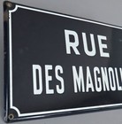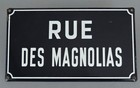 Antique FRENCH Enamel 18" SIGN Plaque RUE des MAGNOLIAS White Lettering on BLUE