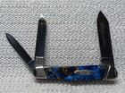 The product is a vintage folding knife from Case & Sons Tested XX, featuring a blue two-toned handle and three blades. Made in the United States, this knife is ambidextrous and original in design. With a rich history and distinct color scheme, this collectable piece is sure to appeal to avid knife collectors looking for unique and authentic items.