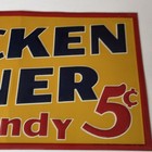 Very old tin Chicken Dinner Candy Sign, in extremely good condition. Red boarder Eat Chicken Dinner 5 cents, all embossed. Very light bend in center area of sign. Amazing condition for its age. Size is 23 1/2” x 11 3/4” Manufactured by Robertson Steel & Iron Co. This is a good one, comes from a very large collection owned for many years. Circa 1950’s