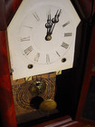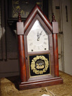 YOU ARE BIDDING ON A RARE ANTIQUE 1883 ANSONIA CLOCK CO. SHARP GOTHIC STEEPLE SHELF CLOCK IN GOOD WORKING ORDER. SERVICED WITHIN THE LAST SIX MONTHS BY A CLOCK PROFESSIONAL 8 DAY PINNED MOVEMENT IS GOOD. FOUND IN TRAN DUY LY'S BOOK ON ANSONIA CLOCKS ON PAGE 440. CASE IS GOOD CONDITION BUT HAS A FEW NICKS THAI HAVE BEEN TOUCHED UP TO MATCH. GLASS IS GOOD REVERSE PAINTING IS GOOD AND DEPICTS THE CONSTITUTION WITH AMERICAN FLAGS.. METAL DIAL IS GOOD WITH SOME FADING. CLOCK STRIKES THE HOURS ON A DEEP SOUNDING COILED GONG. COMES WITH KEY AND ADJUSTABLE PENDULUM. ORIGINAL HANDS. A RARE CLOCK FOR YOUR COLLECTION. DIMENSIONS: 19.5 INCHES TALL, 11 INCHES WIDE, AND 4.5 INCHES DEEP. CLOCK WILL BE DOUBLE BOXED AND INSURED FOR SHIPPING. THANKS