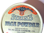 NICE ANTIQUE STEIN'S FACE POWDER TIN for STAGE or BOUDOIR GREAT PRINT & GRAPHICS