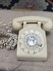 Long cord. No markings except made in USA untested The product is a vintage rotary dial telephone in beige, cream, or tan, made in the USA. It is an original piece, making it a unique and collectible item for those interested in telephones from the past. With its classic design and historical significance, this desk phone would make a charming addition to any collection or a great conversation piece in a vintage-inspired setting.