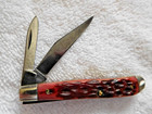 DESCRIPTION: This auction is fora vintage peanut pattern Robeson ShurEdge USA pocket knife with imitation strawberry bone handles. The knife is approximately 2-3/4" long closed. The clip and pen blade do not appear to have been used, but have darken with years of put away. Both blades are tight and snap both opening and closing. No shrinkage or damage to the handles. Front handle has the Robeson shield. Tang of the master blade stamped ROBESON SHUREDGE USA. Back of the blade has the pattern number. Nice addition to any collection that I am offering with NO RESERVE. Good Luck!