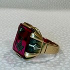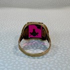 Ring is stamped 10K. The large rectangle stone is unknown, it appears red or burgundy depending on light. The small white stone in the top left corner is also unknown.