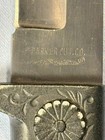The Parker Cut Co Japanese Samurai Tanto Fighting Knife is a collectible fixed blade knife featuring a surgical steel blade with a length of 6 3/4 inches. The knife is designed in a traditional Tanto style with a plain edge and includes a sheath. The handle is made of metal and the knife was manufactured in Japan. The overall length is 12" Great condition. It has a couple of tiny knicks in the blade near the curve. Please see photos for your own assessment.