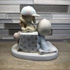 This is a sweet boy crawling out of a wrapped Christmas gift with his puppy dog friend sitting on top of the box with baseball gear. This 1989 piece is titled "Wishing You A Very Successful Season. This ceramic piece is about 5" in height.