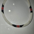 The White, Black, Red Seed Bead Woven Necklace is a stylish and versatile piece of jewelry that showcases intricate seed bead weaving. The necklace features tube-shaped beads in white, with black and red accents, creating a bold and eye-catching design. Made from high-quality seed beads, this necklace is perfect for adding a pop of color and a touch of craftsmanship to any outfit.