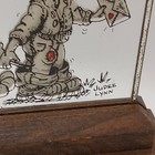 1976 Leonard Creations Wood & Glass Plaque Reverse Painted On Glass With Wood Base 5"H x4.25"W Glass Reverse Painted Plaque B&W Boy, big eyes, holding a flower and a "To You" Love letter Leonard Creations, design by Judee Lynn Inserted into dark brown stand Originally might have had a sentiment label adhered to front of base Frame Edge is tarnished, no label on wooden stand