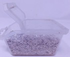Sizable container of silver bugle beads and gold round beads, as found. Without container, beads weigh 510 grams. It looks like very few gold colored round beads mixed in; the vast majority of the population are the silver cylindrical beads.