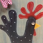 Handmade wooden chicken wall hanging. Shows an adorable black chicken w/ white polka dots & a button for an eye. A wire for wall hanging, and a gingham accent bow. Measures approx 15"x9 1/4". Country Farmhouse Rustic Handpainted Please examine photos & ask all questions prior to purchase. Item pictured is exact item you will receive. See photos for measurements. Condition: Pre-Owned --as found; may need to be cleaned --pre-loved items may have minor surface marks/scratches 5841