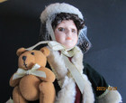 This is a vintage Victorian Christmas Doll music box by The San Francisco Music Box Co. Doll is wearing a green velvet coat with tan fur around the edges. She has on a red satin dress with lace edging and a white netting and bloomers underneath. She also is wearing her stylish brown leather boots and is carrying a teddy bear. She has the original tag connected to her arm and the original hairnet covering her hair. Her porcelain head & hands are hand painted by artisans. Doll is 12 inches tall and is for decorative purposes, not for children. The doll key to wind up is on the back and plays Chestnuts Roasting on an Open Fire. She is in the original box, the doll in mint condition, box has some wear.