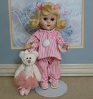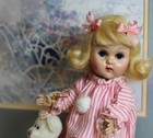 This sweet Ginny is a 1956-57 doll. She has her center part blonde custom made mohair wig. Her body is in very good condition and arms are tightly strung and worker works. Tightly Strung Arms and Walker Works.