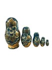 This Vintage Russian Matryoshka Nesting Dolls Set features five hand-painted dolls in a folk art style, with a blue floral design. Each doll is made of wood and are nesting dolls, perfect for collectors or those interested in Russian culture. The set includes dolls with blonde and yellow hair, blue eyes, and a fair complexion, reflecting a traditional Caucasian ethnicity. The dolls are 3 inches in length and are designed in a stackable format, making them a unique and charming addition to any doll collection. Great condition Smoke free home