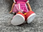 She has squeezable vinyl and soft eyelashes (all intact). She can hold a pose, eyes function normally, and is clean with no noticeable marks or odors. This set is missing the red vinyl jumper, which had a lot of flaking.