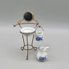 Enhance your dollhouse bathroom or bedroom with this charming miniature washstand set. This delightful 3-piece collection features a delicate metal washstand frame with an integrated mirror and porcelain basin, beautifully accented with blue trim. It comes complete with two coordinating porcelain pitchers, both adorned with a sweet 'Home Sweet Home' motif in a blue floral design. One pitcher is designed to hang from the washstand, while the other is a standalone piece. Perfect for adding a touch of vintage elegance and domestic charm to your 1:12 scale dollhouse.