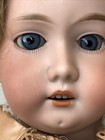 Has a human hair blonde wig and blue sleep eyes. Has a leather body with bisque arms. Gigi's Dolls & Sherry's Teddy Bears, Inc.