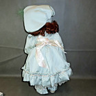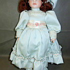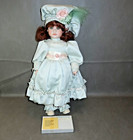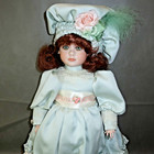 This is a Reed & Barton Classic Editions Amber Girl Porcelain Doll w Silver Plated Mirror in original box. Dolls has bright green eyes, wearing a mint green dress with hat and has reddish brown hair.