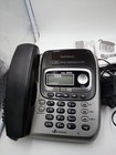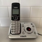 VTech Cordless Phone with Digital Answering System. Includes base and handset. Base powers on and answering system lights up as shown. Handset displays "No Battery" and will require a replacement battery. Silver finish with easy-to-use keypad, caller ID buttons, volume controls, and built-in answering machine. Normal cosmetic wear from use. Power cord included
