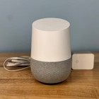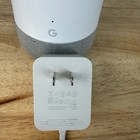 Light scuffs and marks from previous use. Small hole in the mesh part. This has been tested and is in great working condition. Keywords: Smart Home, Bluetooth Speaker, Voice Assistant, AI, Wireless, Home Automation, Tech, Gadget, Minimalist, Modern, Streaming, Audio, Google Assistant, Connected Home, Grey Fabric