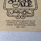 This is a vintage menu from the iconic Steak and Ale Restaurant, featuring the 'Jolly Ox' branding. The menu lists prices and offerings from what appears to be the 1970s or 1980s era, providing a fascinating glimpse into dining history. It includes the address for the Norfolk, Virginia location at Janof Shopping Center. A great collectible for fans of vintage restaurant advertising, Steak and Ale memorabilia, or Virginia local history.