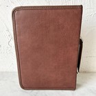 Faux leather cover has a carry handle and zippered closure. Interior ribbon. Extra largesize fits Bibles and books up to 10" wide x 7" long and up to 1.50" spine. Cracking along edge shown in close up photos.