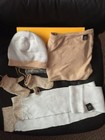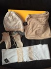 F0TY2 MITTENS WINTER SIGNATURE PRINT. FENDI BABY SET SCARF GLOVES HAT BAG WOOL. AUTHENTIC FENDI BABY SET (HAT, GLOVES, SCARF) WOOL WITH BAG. HAT (REVERSIBLE). GLOVES W STRING ATTACHED. CARRYING BAG. All inside the original box.