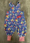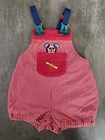 Blue green bubble fish romper. Size infant. Snap crotch. Light wash wear and fade. Red and white airplane bear striped short romper. Size X small, with suspenders - which have great elastic. The leg elastic is no longer stretchy and is aged - so will not gather.
