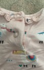 Size 0 to 3 months. Light pink with llama print throughout. Elasticized at bottom. Hand cuffins. Snap close at back of neck. Made from Viscose from bamboo/spandex. In excellent condition. Item will ship via USPS within 1 to 2 business days from time payment is received. Thanks for looking.