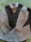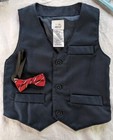 This 3-piece suit set in gray features a tuxedo style vest and pants with a blue clip-on tie, perfect for dressing up a little boy aged 6-9 months. The formal look is ideal for special occasions or Baby's first birthday, adding a touch of sophistication to the young gentleman's ensemble. The set includes a vest in a classic design, making it a versatile addition to his little wardrobe. Please review pictures for self satisfaction. As is. No returns accepted. (A20)