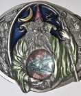 1992 Bergamot Pewter Belt Buckle Wizard With Magic Crystal Ball Orb Owl & Dragon