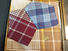 Appear unused - their box is all beat up, but the handkerchiefs are fine. The box says they are cut 17" x 17" and are a polyester/cotton blend, although the gold sticker inside says they are all cotton.