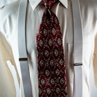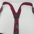 This product is a vintage pair of Y-back suspenders in a burgundy color with green medallion silk jacquard button ends. Made of leather with adjustable features, these suspenders are designed for men and are one size fits all. The United States-made suspenders offer a classic and stylish accessory for men looking to add a touch of sophistication to their ensemble.