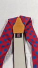 These vintage suspenders feature a bold red and blue polka dot pattern with leather accents. They are designed for a classic look and adjustable for a comfortable fit.