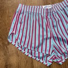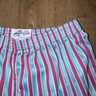 These are in very nice condition. The shorts have a light blue, magenta pink, and white striped pattern and have a gray Dolfin logo on the leg. They have an elastic waist, are not lined, are very stretchy, are very thin, and are 90% nylon/ 10% polyester.