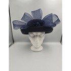 Elegant navy blue straw hat features a structured boater-style crown with a sophisticated upturned brim. A large, airy mesh bow and a central satin rose detail add a touch of classic glamour, making it a perfect choice for formal daytime events. The woven texture has a subtle sheen that catches the light beautifully. This piece is in excellent condition and ready for its next special occasion. Please note, slight rough spot on the front edge of the hat. Reference photos. Keywords: Kentucky Derby, Church Hat, Wedding Guest, Royal Ascot, Tea Party, Vintage Style, Fascinator, Formal Wear, Garden Party, Mother of the Bride, Easter Sunday, Sophisticated, Classic, Navy Blue, Millinery