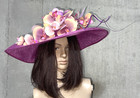 Made of purple tulle ribbon tied into a butterfly Kentucky Derby hat. With ribbon flower accent around the brim. Original hat is a pillbox.