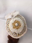 Elevate your special occasions with this exquisite Handmade Crochet Kippah, a fashionable and traditional women's head covering that effortlessly blends spirituality with style. Adorned with a delicate floral pattern on a pristine white background, it's designed to complement any ensemble, making it an ideal choice for weddings or other significant events. This one-size kippah is crafted with meticulous attention to detail, reflecting both modern elegance and timeless charm. Its vintage allure ensures a unique touch to your mitzvah or personal wardrobe, while the unknown country of manufacture adds an air of mystery and allure to this already captivating accessory.