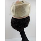 A charming vintage pillbox hat with a delicate veil and floral embellishment. This hat features a ribbed metallic gold-toned crown and a smooth taupe brim. A sweet pink floral accent and a brown ribbon bow adorn the side, complemented by a fine netting veil that drapes elegantly.